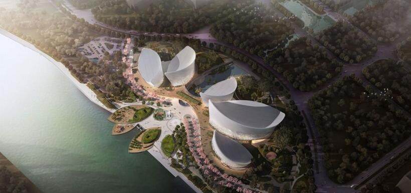 據(jù)效果圖,海峽文化藝術(shù)中心五大場館造型柔美,由閩江引入的一條河流穿中心而過,使得中心的廣場成為一處大型親水平臺。